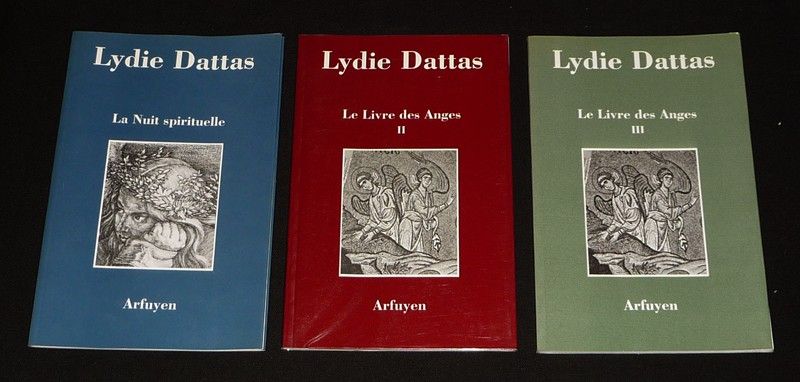 In-8 (13,5 x 20,5 cm), dos carré collé, lot de 3 ouvrages de Lydie Dattas : La Nuit spirituelle (1994, 29 pp.) - Le Livre des Anges II (1995, 47 pp.) - Le Livre des Anges III (1998, 53 pp.) ; ex-libris manuscrit sur les premières gardes, le 2e volume est couvert d'une protection en plastique transparent scotchée directement sur les contreplats, par ailleurs bon état général.