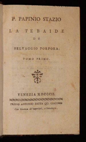 Deux volumes in-12 (11 x 17 cm), reliure demi-veau, dos lisse orné de dorures, xlviii-259 et 286 pages, texte en italien ; petits trous dans le cuir aux mors du tome 2, pages 7 à 10 désolidarisées au tome 2, par ailleurs bon état général.