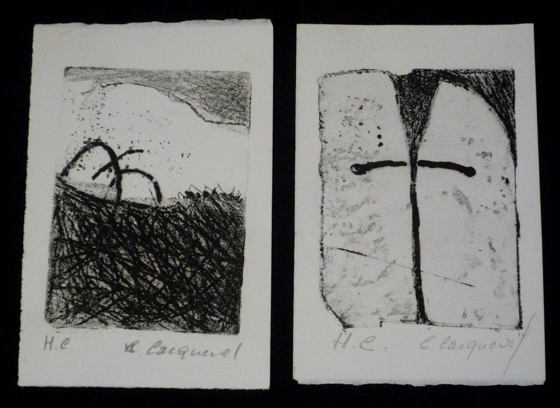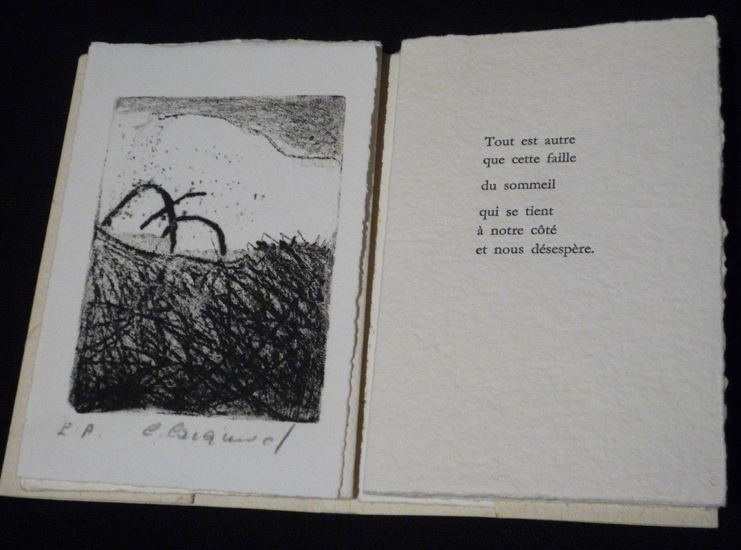In-16 (8,1 x 12,9 cm), feuilles sous couverture, non paginé, 1 de 33 exemplaires de l'édition originale imprimée à la main sur Chanvre Lin et Coton du Moulin à papier de Brousse, 1 de 22 exemplaires contenant deux gravures de Catherine Cacquevel, signées par l'artiste (+ une gravure en double) ; très bel état.