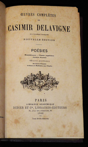 In-12 (12,5 x 17,7 cm), reliure demi-peau, dos à 3 nerfs, mention "théâtre" dorée au dos erronée, il s'agit bien du tome de poésie des oeuvres complètes de Casimir Delavigne, 200 pages ; quelques épidermures sur le cuir, petites traces aux plats, quelques rousseurs à l'intérieur, par ailleurs assez bon état général.