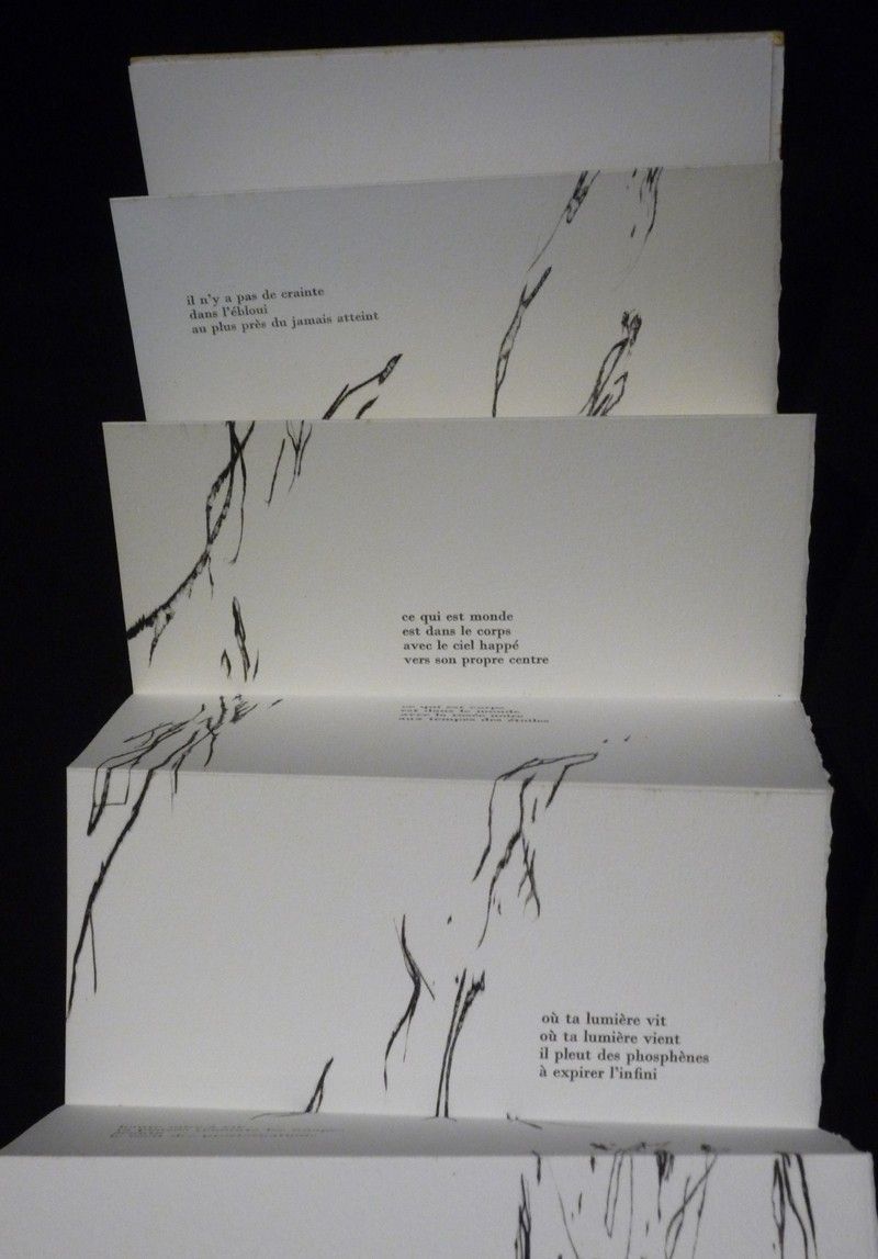 In-12 (9,2 x 19 cm), reliure d'éditeur en accordéon lisible recto-verso, 1 de 10 exemplaires numérotés réservés aux collaborateurs et signés par l'artiste et l'auteur, ouvrage illustré de quatre gravures de Lise-Marie Brochen ; très bon état.
