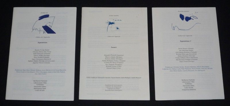 Trois volumes in-8 (15,3 x 21,5 cm), 3 numéros des "Cahiers de l'approche" tirés à uniquement 100 exemplaires et ornés d'un dessin (différent pour chaque numéro) de Catherine Caquevel, 16 pages par volume ; Vol. 1 : Premier automne - Lueurs (2011) ; Vol. 2 : Premier état - Septentrions (2012) ; Vol. 3 : Deuxième automne - Septentrions 2 (2012) ; très bon état.