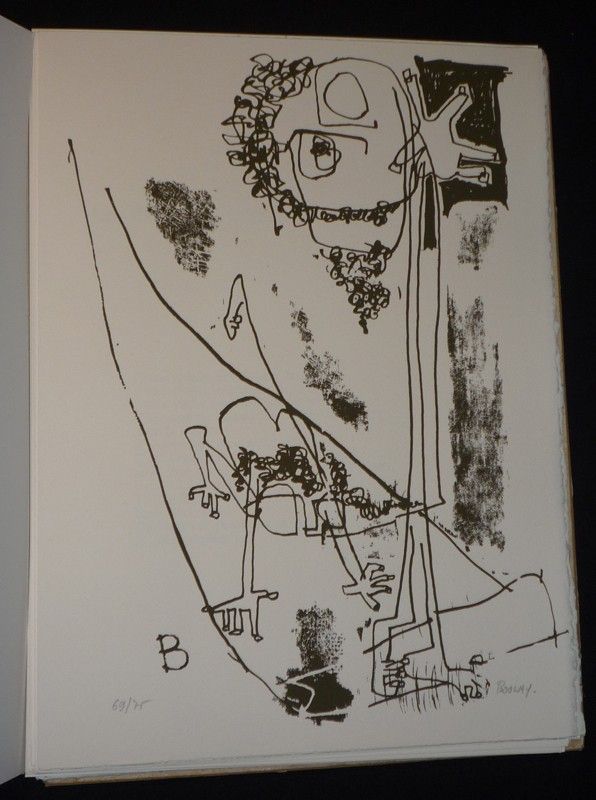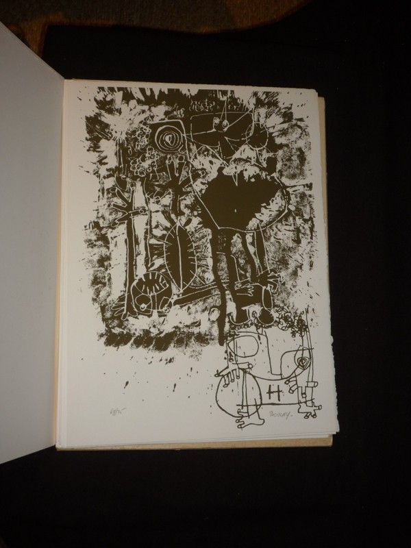 In-folio (28,5 x 38,3 cm), planches sous couverture et emboîtage, paginé de A à Q, pas de mention d'éditeur, 1 des 75 exemplaires sur pur fil, 17 sérigraphies en noir et blanc signées et numérotées ; deux arêtes de l'étui fendues, étui inégalement bruni, pliure et brunissures au dos de la couverture, par ailleurs intérieur frais, assez bon état général par ailleurs.