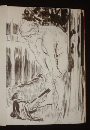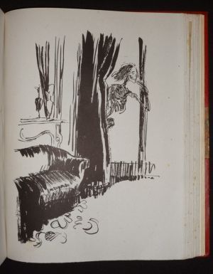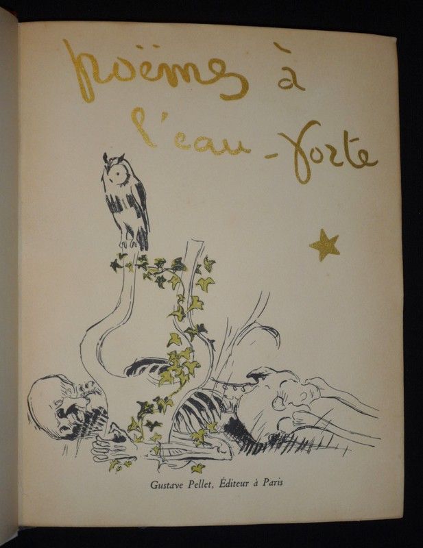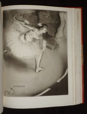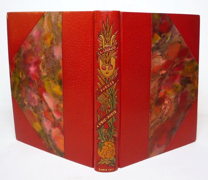SUITE DES EAUX-FORTES SUR CHINE. IMPORTANTE RELIURE. Paris, Gustave Pellet, 1914. In-4 (20,3 x 24,5 cm), reliure de l'époque signée René Aussourd, Bradel, dos et coins de maroquin rouge, dos orné de motifs mosaïqués de feuillages, plats de papier marbrés, tête dorée, couverture et dos conservés. Tirage unique à 80 exemplaires sur papier vélin filigrané, avec un dessin original à la plume signé au crayon par Louis Legrand, et 45 dessins reproduits dans le texte, 30 eaux-fortes originales de Louis Legrand et suite complète sur Chine (tirée à seulement 30 exemplaire), illustrant les textes de Baudelaire, Mallarmé, Gautier, etc. ; SUPERBE EXEMPLAIRE.