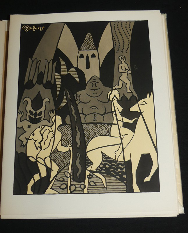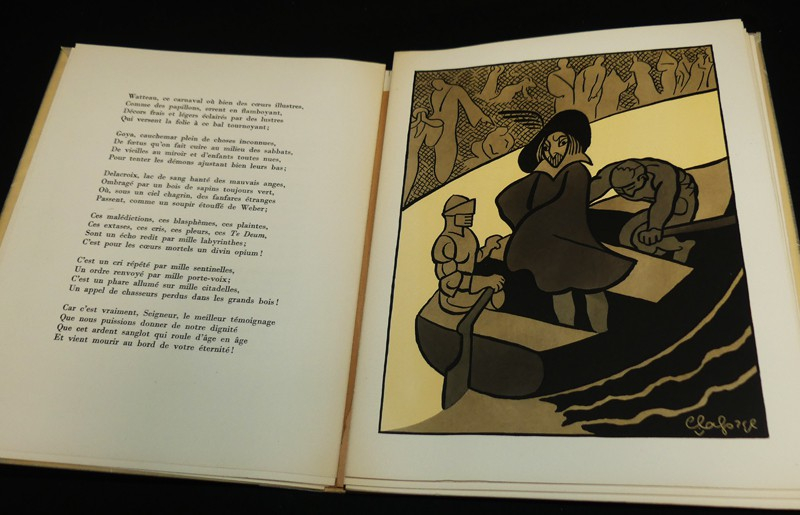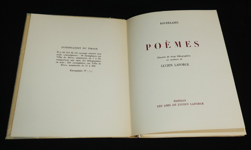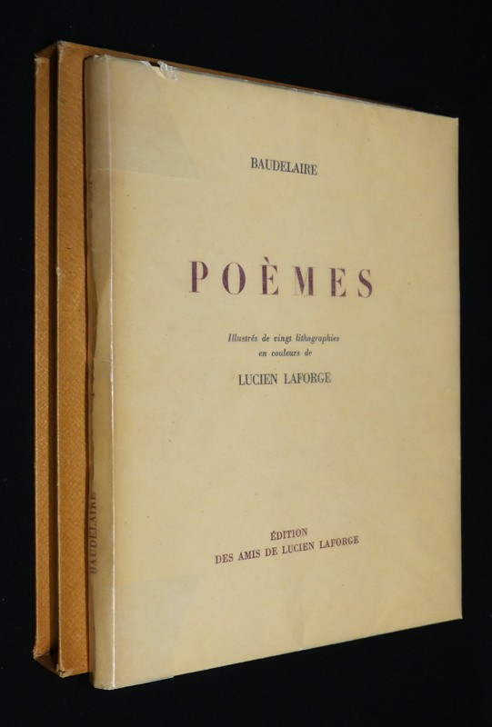20 magnifiques illustrations hors texte de Lucien Laforge, en trois teintes, noire, grise et jaune : vingt lithographies originales, pour XX poèmes. In-4, en feuilles, couverture imprimée (étui de l'éditeur). Tirage limité à 300 exemplaires numérotés sur vélin de Rives. Un des 250 exemplaires sur Vélin de Rives imprimé sur les presses de Georges Girard, imprimeur à Paris ; bel exemplaire sous son cristal d'origine, dos très légèrement jauni.