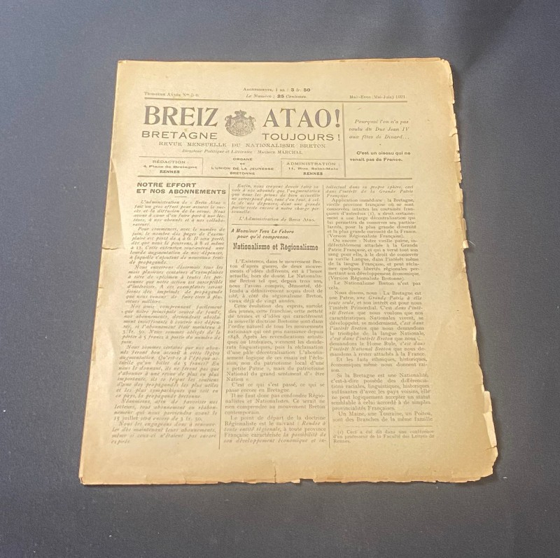 Rare numéro de Breiz Atao, numéro double 5-6 de mai juin 1921 troisième année de cette publication dont la première période se finira au numéro 103 en juillet 1927. Le journal a traversé trois périodes la première ayant duré de 1919 à 1927 : l'organe du Groupe régionaliste breton, la seconde durera de 1927 à 1931 hebdomadaire du Parti Autonomiste Breton, puis la troisième : l'organe du Parti national breton (1931-1939). Lors de cette première période le tirage du journal connait un maximum de 500 exemplaires d'où l'extrême rareté des exemplaires de ce titre. En effet nous ne sommes pas sans savoir, que les quotidiens et les hebdomadaires sont souvent jetés après lecture ; papier jauni, bords comportant de petites déchirures, bon état.
