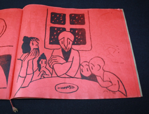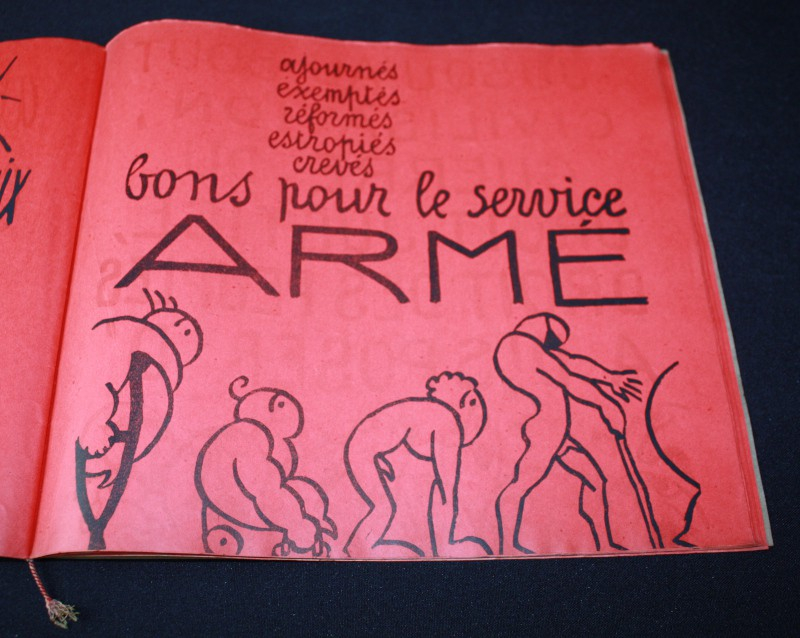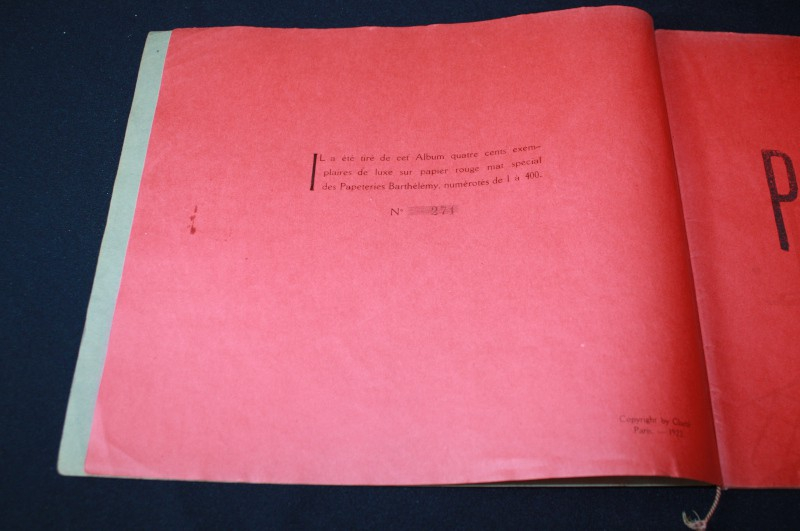 Album au format italien de 27,5 cm x 25cm, agrafé, cordelette rouge. Edition originale et premier tirage des illustrations de Lucien Laforge, un des 400 exemplaires de luxe sur papier rouge mat spécial des papeteries Barthélémy, seuls grands papiers annoncés. Imprimé à la grande imprimerie "Perfecta", 8 rue Neuve-Popincourt, Paris (XI°) Rare album antimilitariste, sur grand papier qui décrit les gens de l'arrière, ceux des estaminets, ceux de la rue, les prostituées, les curées, les politiques ceux qui y échappe. Tout ce beau monde est décrit sans retenue. Une charge antimilitariste et pacifique, graphique et rouge !!! ; bel exemplaire avec quelques traces d'usages sans aucune gravité.