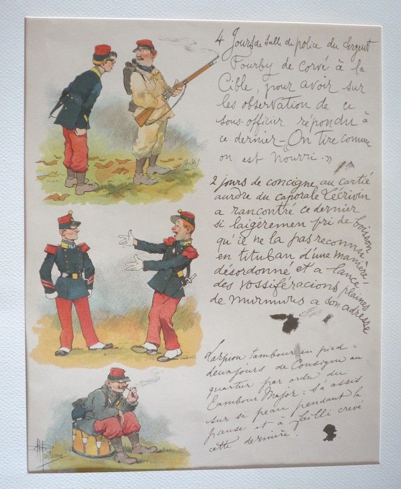 Illustration en couleurs (22,5 x 28 cm sur support 27,5 x 36 cm) d'Albert Guillaume, tiré de l'album militaire "Mon Sursis" ; bords du support légèrement usés, bon état....