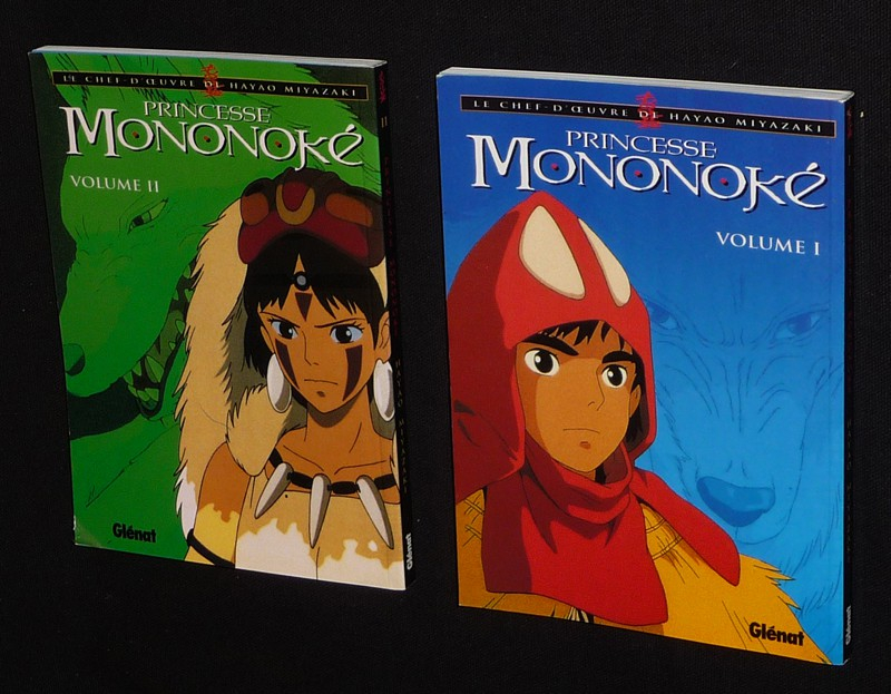 Deux volumes in-12 (13 x 18 cm), dos carré collé, Volumes 1 et 2 du manga "Princesse Mononoké", 143 et 143 pages, imprimés en 2007 et en 2000 respectivement ; Volume 1 en très bon état, légère pliure et pelliculage décollé dans un coin au premier plat du volume 2, par ailleurs bon état général.