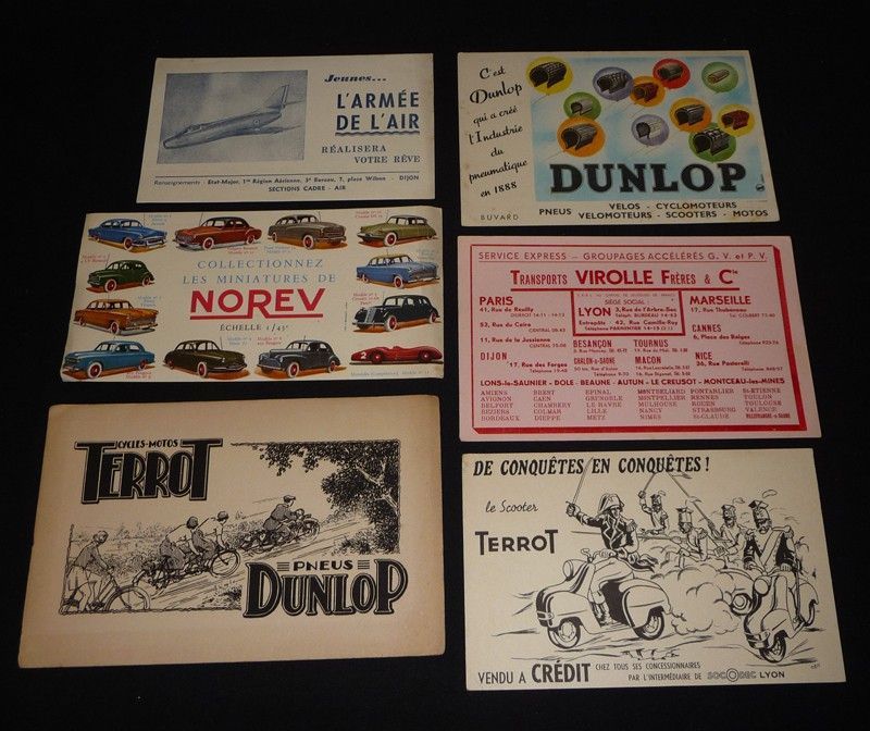 Lot de 6 buvards publicitaires sur le thème de l'aviation, chemin de fer, automobile, etc. : "Jeunes, l'armée de l'air réalisera votre rêve" [coin corné, quelques rousseurs sur le bord droit au recto] // "'C'est DUNLOP qui a créé l'industrie du pneumatique en 1888" [trois coins cornés, quelques rousseurs au recto et au verso] // "Collectionnez les miniatures de NOREV" [petites pliures sur les bords latéraux, tampon et quelques rousseurs au verso] // "Scooter Terrot, de conquêtes en conquêtes !" [deux coins cornés] // "Cycles-moto Terrot / Pneus Dunlop" [coins cornés, bords brunis] // "Transports Virolles Frères & Cie" [quelques rousseurs au verso] ; assez bon état.
