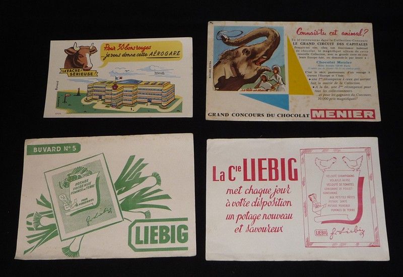 Lot de 4 papiers buvards publicitaires pour produits alimentaires : La Vache sérieuse - Chocolat Menier - Liebig (2 modèles différents) ; rousseurs sur le buvard Menier, pliures sur les bords des buvards Liebig, par ailleurs assez bon état.