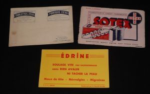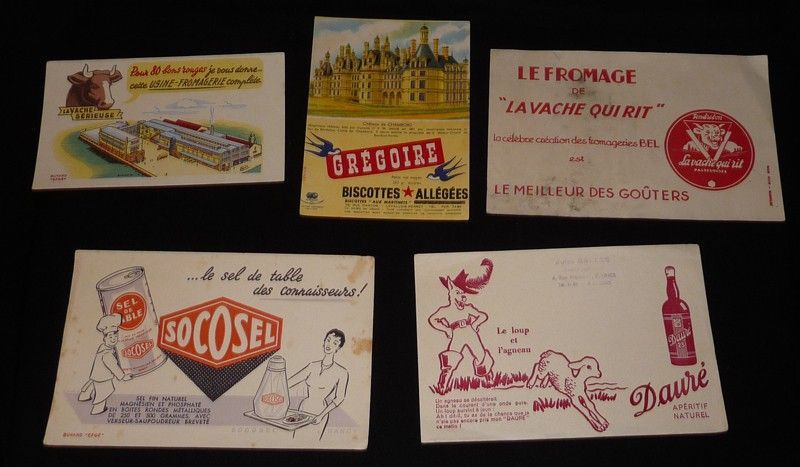 Lot de 5 papiers buvards publicitaires pour produits alimentaires : Dauré - Socosel - Biscottes allégées Grégoire - La Vache qui rit - La Vache sérieuse ; tampon sur le buvard Dauré, rousseurs sur le Socosel, traces sur La Vache qui rit, par ailleurs assez bon état.