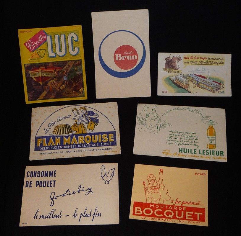 Lot de 7 papiers buvards publicitaires pour produits alimentaires : Biscottes Luc - Biscuits Brun - Consommé de poulet Liebig - La Vache sérieuse - Huile Lesieur - Moutarde Bocquet - Flan Marquise ; quelques rousseurs, pliures et marques d'usage selon le buvard, assez bon état.
