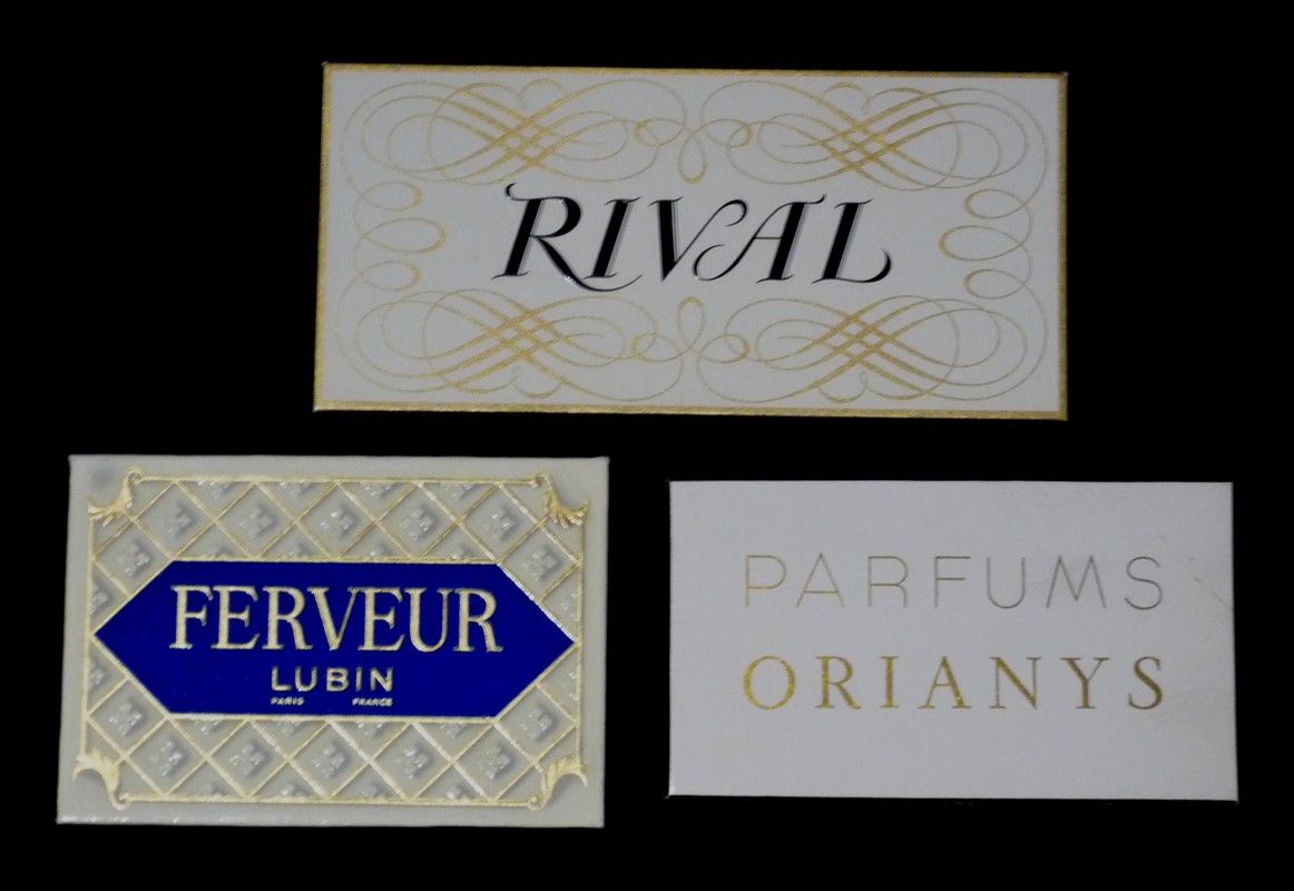 Lot de 3 plaques publicitaires en carton fort pour Rival (14 x 6,6 cm), le parfum "Ferveur" de Lubin (10 x 6,8 cm), et les parfums Orianys (10,5 x 6 cm) ; très bon état.