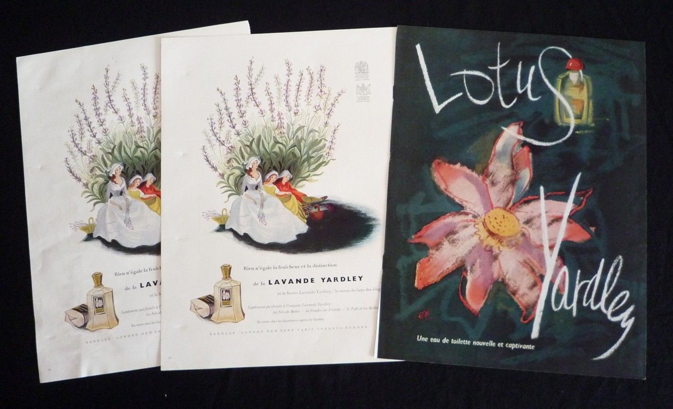 Lot de 5 publicités dont 2 pour les parfums Lubin et 2 pour les parfums Molinard (env. 23,5 x 31,5 cm), plus une troisième pour Molinard sous forme de dépliant 3 volets (34,3 x 16 cm déplié) ;...