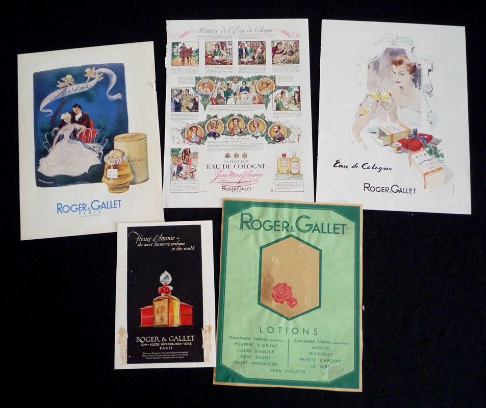 Lot de 5 publicités en couleurs pour Roger & Gallet, dont 3 au format 23,5 x 31,5 cm, 1 au format 15 x 21,5 cm, et 1 au format 21 x 27 cm ; petites traces et légers froissements sur cette dernière, par ailleurs très bon état général.