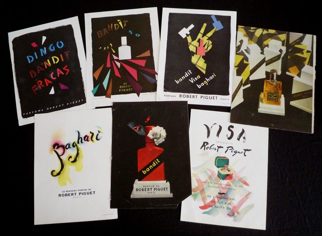 Lot de 7 publicités en couleurs (24 x 31,5 cm), pour les parfums Robert Piguet ; quelques légères marques d'usage sur deux des publicités, par ailleurs très bon état général.