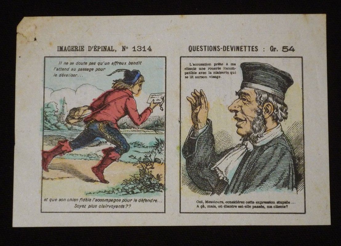 3 exemplaires d'une question-devinette en couleurs (14,8 x 10 cm), publicité pour Docks du Cycle ; quelques petites marques d'usage, bon état général.