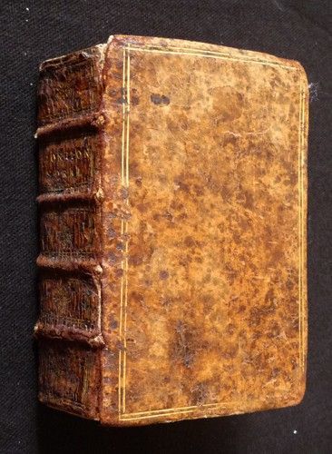 In-16 (7 x 11 cm), reliure plein veau, dos à quatre nerfs orné de caissons et fleurons dorés, liserets sur les plats, tranches mouchetées, texte en latin, page de titre gravée, pagination comme suit : à2 ("Perillustri, ac reverendissimo domino D. Nicolao de Haudion, octavo brugensium episcopo, perpetuo ac hereditario Flandriae cancellario, &c."), à3-à7 ("Nobilissimus et admodum reverendus dominus D. Antonius A Burgundia, ecclesiae cathedralis brugensis canonicus et archidiaconus, R. P. Petro de Vos S. Theol. licentiato ord. eremit. S. Augustini concionum moralium è voluminibus R.P. Hieremiae Drexelii, societatis Iesu presbyteri collectori S.P."), é-é2 ("Collector manipuli drexelliani, benev. suo lectori S.P."), é3 ("Methodus colligendi, pias aristas ex hoc Sacro Concionum Moralium manipulo"), "approbatio" non paginé, puis 864 pages ; manque aux coiffes, coins usés, mors fendus aux coiffes, dos craquelé, marques d'usure sur les plats, intérieur assez frais, état moyen.