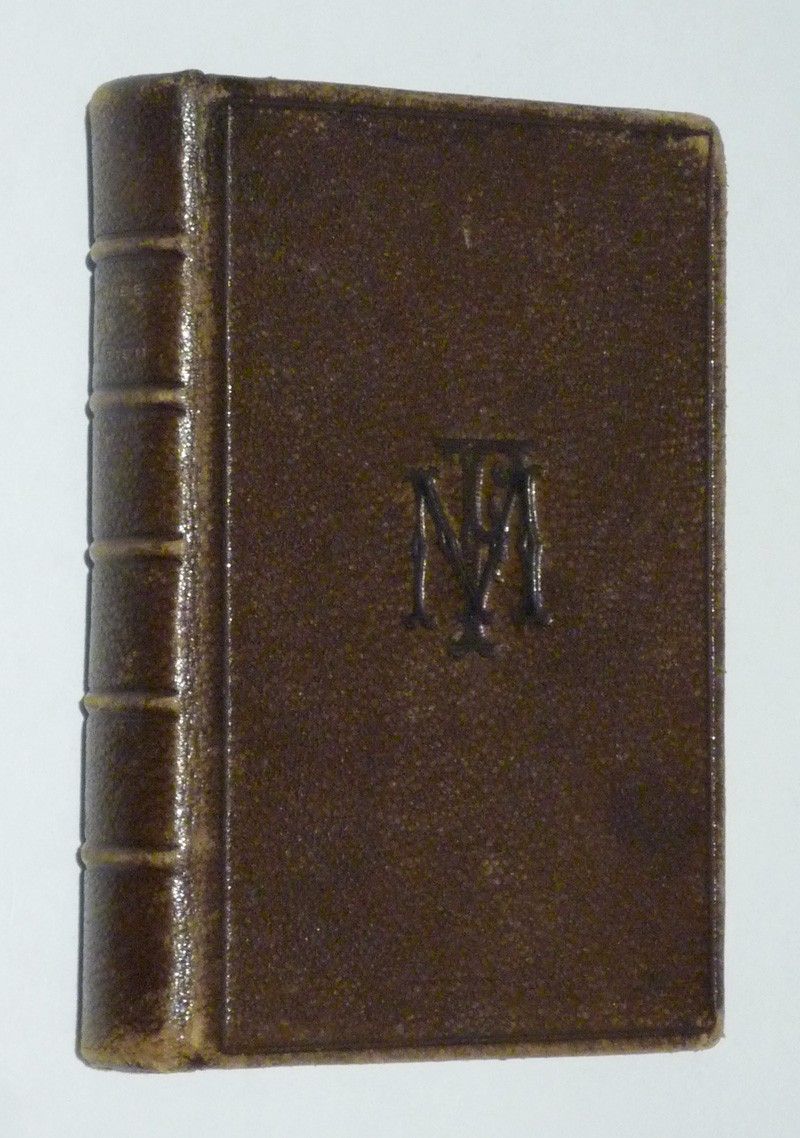 In-18 (7 x 10 cm), reliure pleine peau, dos à 5 nerfs, roulette sur les contreplats, tranches dorées, 384 pages, texte encadré d'un filet rouge, deux gravures hors texte ; page de titre manquante...