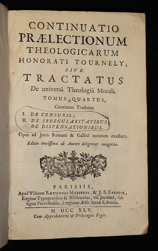 In-8 (13,5 x 19,7 cm), reliure plein veau, dos à 5 nerfs orné de caissons dorés, xiv-829 pages, TOME 4 seul ("continens tractatus I. De censuris ; II. De irregularitatibus ; De dispensationibus"), texte en latin ; épidermures aux plats, manques de cuir aux coiffes, coins et bords des plats, mors fendus en queue, partie du titre entourée en page de titre, par ailleurs intérieur frais, état moyen.