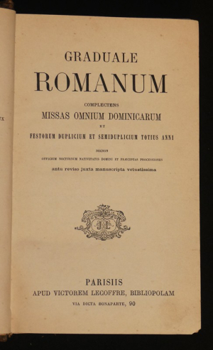 Graduale romanum complectens missae omnium dominicarum et festorum duplicium et semiduplicium totius anni necnon officium nocturnum nativitatis domini et praecipuas processiones antu reviso juxta manuscripta vetustissima