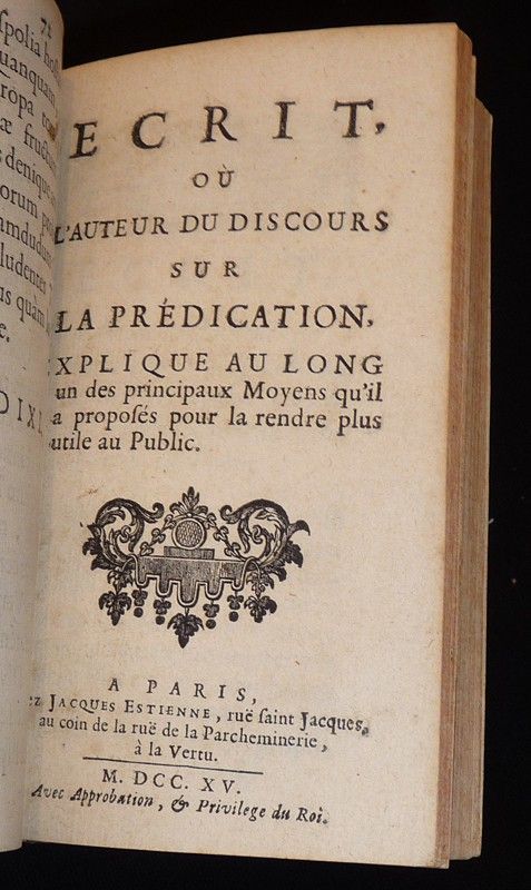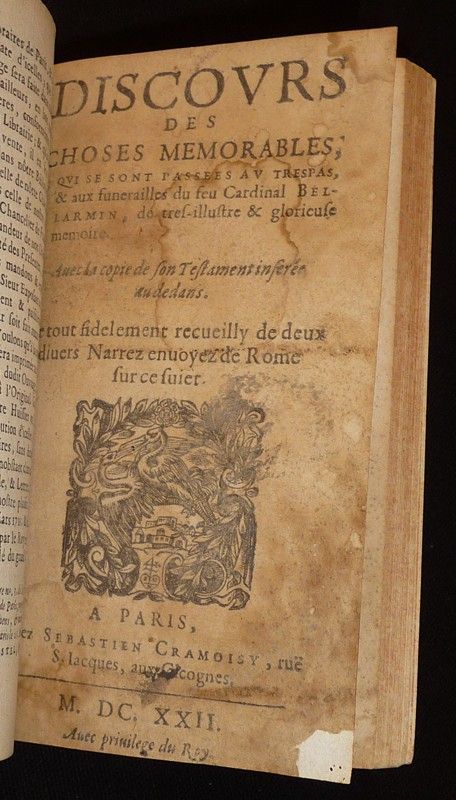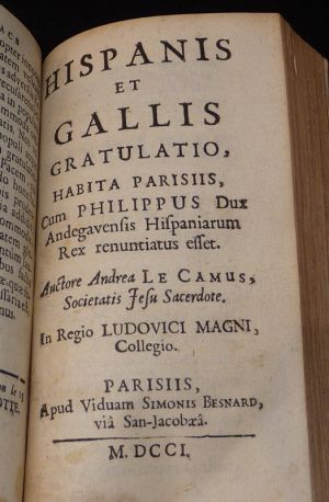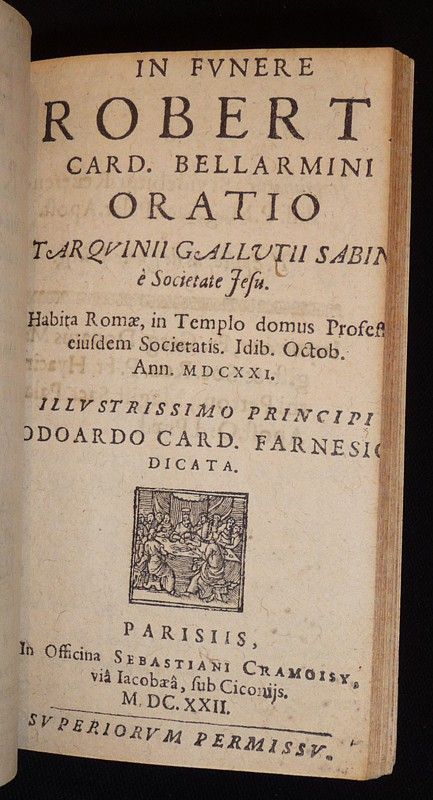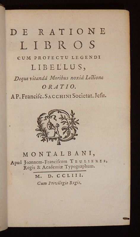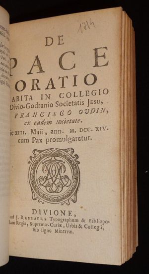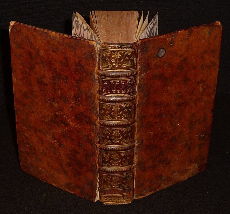 In-12 (9,8 x 15 cm), reliure plein veau, dos à 5 nerfs orné de caissons dorés, recueil de 6 ouvrages reliés ensemble : 1. "De ratione libros cum profectu legendi libellus, Deque vitandâ Moribus noxiâ Lectione oratio. AP. Francisc. Sacchini Societat. Jesu." (1753, Montalbani, apud Joannem-Franciscum Teulieres, 188 pp + table non paginée, texte en latin) // 2. "De pace oratio habita in collegio, Divio-Godranio Societatis-Jesu, a francisco Oudin,ex-eadem societate. Die XIII. Maii, ann. M.DCC.XIV. cum pax promulgaretur" (1714, Divione, apud J. Ressayre Typographum & Bibliopolam Regis, Supremae-Curiae, Urbis & Collegii, sub signo Minervae, 4 ff. non numérotés puis 88 pp., texte en latin) // 3. "Hispanis et Gallis gratulatio, habita parisiis, cum Philippus Dux Andegavensis Hispaniarum Rex renuntiatus effet. AuctoreAndrea Le Camus, Societatis Jesu Sacerdote. In regio Ludovici Magni, Collegio" (1701, Parisiis, Apud Viduam Simonis Besnard, viâ San-Jacobaeâ, 72 pp., texte en latin) // 4. "Ecrit, ou l'auteur du discours sur la prédication, explique au long un des principaux Moyens qu'il a proposés pour la rendre plus utile au public" (1715, A Paris, chez Jacques-Estienne, rüe Saint Jacques, au coin de la ruë de la Parcheminerie, à la Vertu, 46 pp.) // 5. "Discours des choses mémorables, qui se sont passees au trespas, & aux funerailles du feu Cardinal Bellarmin, de tres-illustre & glorieuse mémoire. Avec la copie de son Testament inséré au dedans" (1622, A Paris, chez Sebastien Cramoisy, rue Saint Jacques, aux Gicognes, 47 pp., texte en français sauf le testament, reproduit en latin) // 6. "In funere Robert Card. Bellarmini oratio, Tarquinii Gallutii Sabin è Societate Jesu" (1622, Parisiis, in Officina Sebastiani Cramoisy, viâ Iacobaeâ, sub Ciconijs, 48 pp., texte en latin) ; mors fendus aux coiffes, petits manques de cuir aux coins, papier bruni et traces sur la page de titre du 5e ouvrage du recueil, par ailleurs assez bon état général.