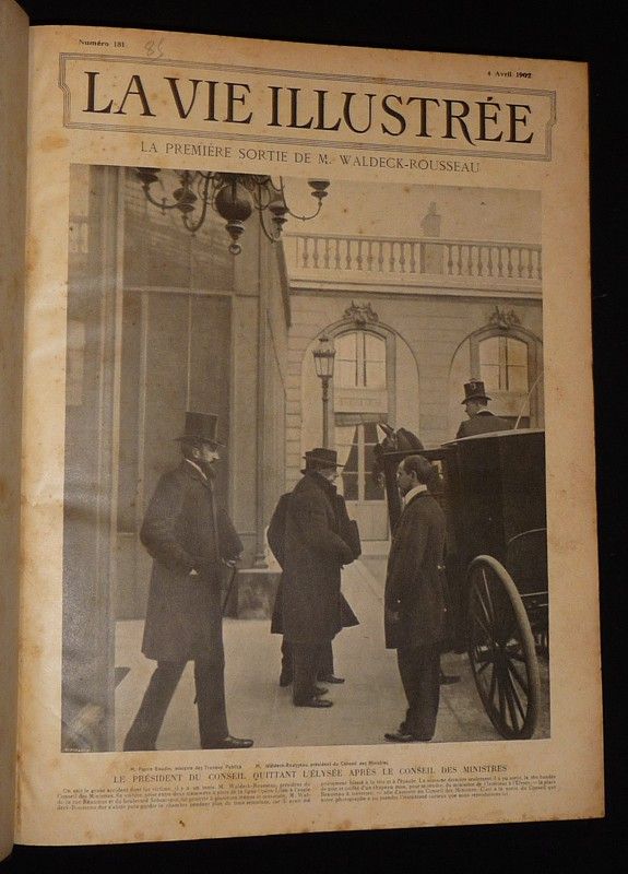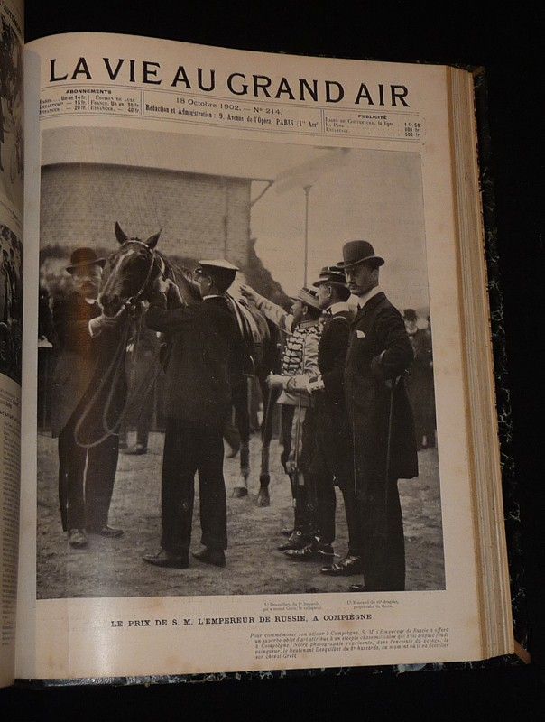 In-folio (29,2 x 35,3 cm), reliure demi-peau, dos lisse orné de filets dorés, recueil incomplet comprenant une grande partie de "La Vie illustrée" pour l'année 1902 : du n°181 (4 avril 1902) au n°213 (14 novembre 1902), puis plusieurs numéros de 1903-1904 : n°262 (23 octobre 1903), n°266 (20 novembre 1903), puis du n°277 (5 février 1904) au n°282 (11 mars 1904). Sont également reliés à la suite 9 numéros de "La Vie au grand air : n°179 (16 février 1902), n°202 (20 juillet 1902), n°204 (9 août 1902), n°207 (30 août 1902), n°212 (4 octobre 1902), n°213 (11 octobre 1902), n°214 (18 octobre 1902), n°215 (25 octobre 1902), n°218 (15 novembre 1902), et 10 numéros de la revue "Armée et marine" : 2e année n°23 (10 juin 1900), 2e année n°36 (9 septembre 1900), 3e année n°5 (3 février 1901), 3e année n°9 (3 mars 1901), 3e année n°11 (17 mars 1901), 3e année n°22 (2 juin 1901), 3e année n°34 (25 août 1901), 3e année n°40 (6 octobre 1901), 3e année n°45 (10 novembre 1901), et 3e année n°47 (24 novembre 1901) ; des épermures sur le cuir, coupes frottées, assez bon état.