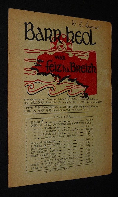 In-8 (16,5 x 22 cm), revue dos agrafé, 28 pages, texte en breton ; quelques traces sur les plats, ex-libris manuscrit au premier plat, papier bruni, assez bon état.
