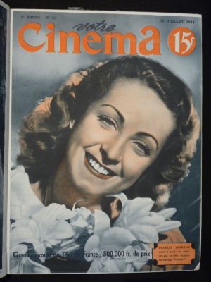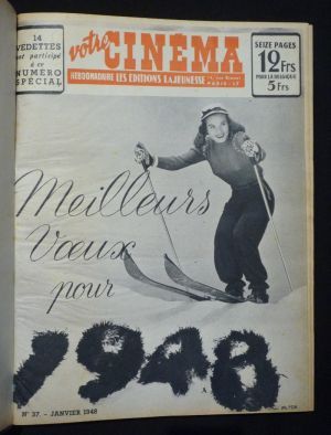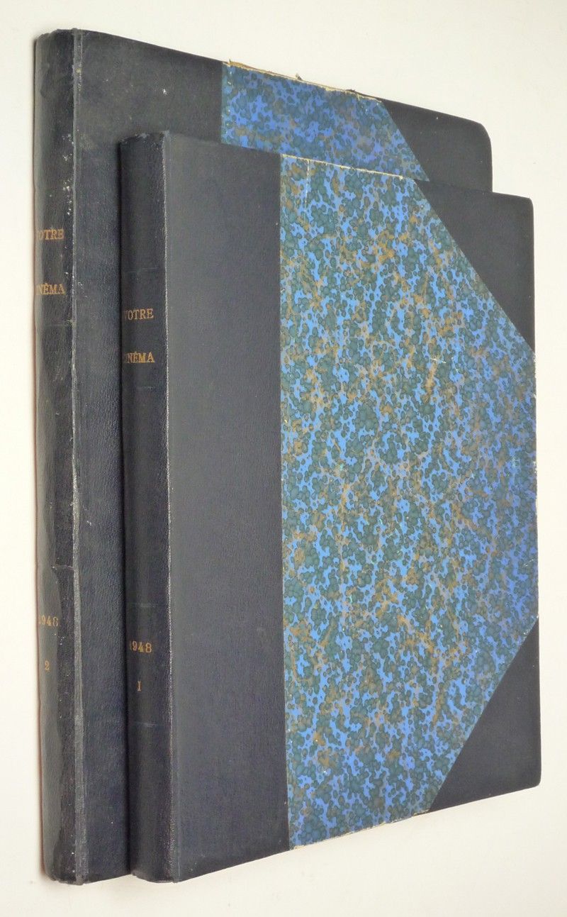 Deux volumes in-4 (25,5 x 33 cm) et in-folio (28,5 x 37,7 cm), reliure demi-toile à coins, année 1948 complète de la revue "Votre Cinéma", dirigée par Robert Vorms, du n°37 (janvier 1948) au n°62 (29 juin 1948) et du n°63 (6 juillet 1948) au n°88 (28 décembre 1948), SAUF le n°73 manquant, nombreuses photographies en noir et blanc ; bords des plats usées, par ailleurs bon état général.