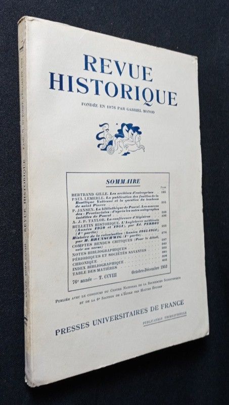 In-8 (16.5 x 25 cm.), revue brochée, non coupé, 186 à 408 pages, Revue historique, tome CCVIII, octobre-décembre 1952 (76e année), ouvrage collectif,a u sommaire: "Les archives d'entreprise" de B. Gille / La publication des fouilles de la basilique vaticane et la question du tombeau de Saint-Pierre de P. Lemerle / La bibliothèque de Pascal de P. Jansen / La conférence d'Algésiras d'A.J.P. Taylor ... ; plats légèrement piqués, ruban adhésif au bas du dos (peu visible), dos un peu plissé et incurvé, mors et coiffes frottés, intérieur frais, assez bon état.