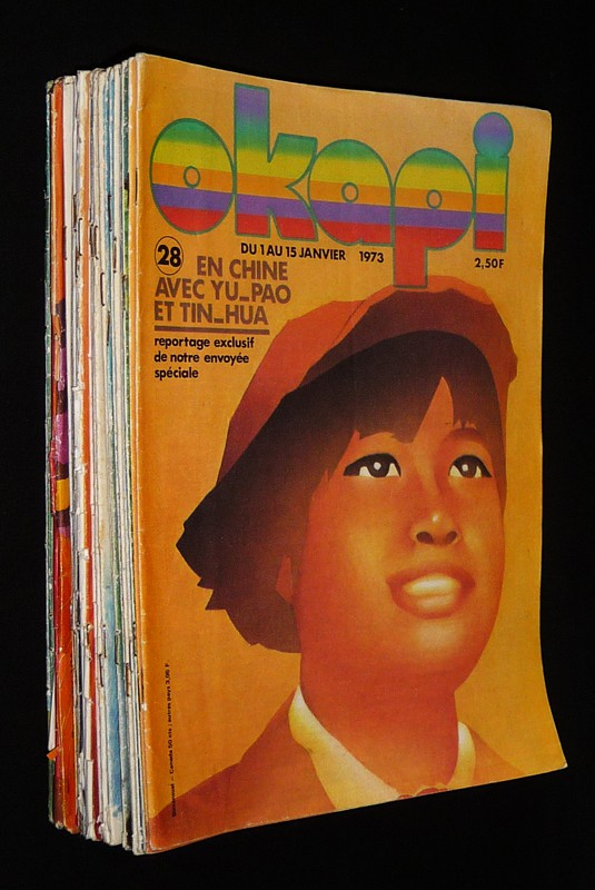 In-4 (21 x 29,7 cm), revue dos agrafé, année 1973 complète de "Okapi", du n°28 (1-15 janvier 1973) au n°51 (15-31 décembre 1973), le n°28 est en double exemplaire ; dos frottés, quelques incidents aux plats plus ou moins importants selon le numéro, note manuscrite au quatrième plat du n°37, dos du n°41 déchiré, dos fendu et quatrième plat partiellement découpé aux n°47 et 48, usures au quatrième plat du n°51, par ailleurs assez bon état général.