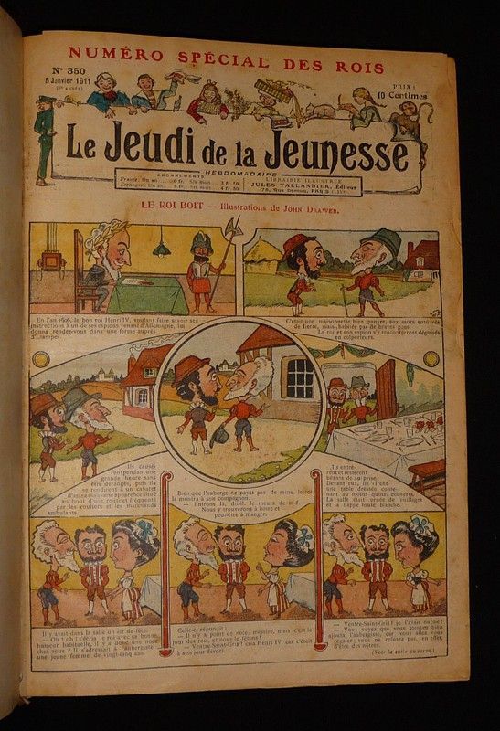 In-4 (23 x 32,5 cm), reliure demi-toile, dos lisse, année 1911 complète de la revue "Le Jeudi de la jeunesse", du n°350 (5 janvier 1911) au n°401 (28 décembre 1911), cette revue hebdomadaire contient des bandes dessinées (planches en noir et en couleurs), des feuilletons, des jeux, etc., illustrations de Drawer, Lajarrige, La Nézière, etc. ; dos insolé, coiffes, mors et coupes frottées, mors supérieur un peu fendu en queue, papier reliure un peu usé aux plats, quelques rousseurs éparses à l'intérieur par ailleurs bien conservé, assez bon état.