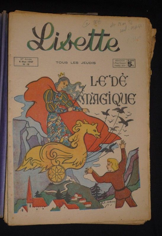 In-4 (20,5 x 29,3 cm), broché, n°18 à 52 (SAUF les n,°23, 26 et 27) de 1947 de "Lisette" ; couverture ne correspondant pas au contenu du recueil, ensemble fragile, pliures au dos, bords des plats abîmés, en l'état.