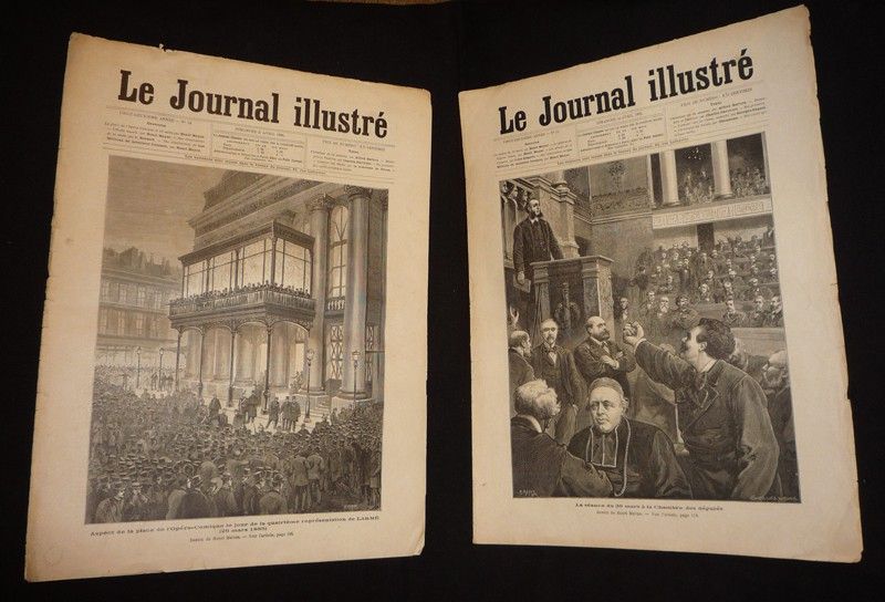 In-folio (29 x 39 cm), journal en feuilles, lot de 11 numéros de l'année 1885 du "Journal illustré" : du n°6 (8 février 1885) au n°9 (1er mars 1885), n°11 (15 mars 1885), puis du n°13 (29 mars 1885) au n°18 (3 mai 1885) ; quelques déchirures sur les bords notamment aux dos, quelques rousseurs sur les plats, assez bon état.