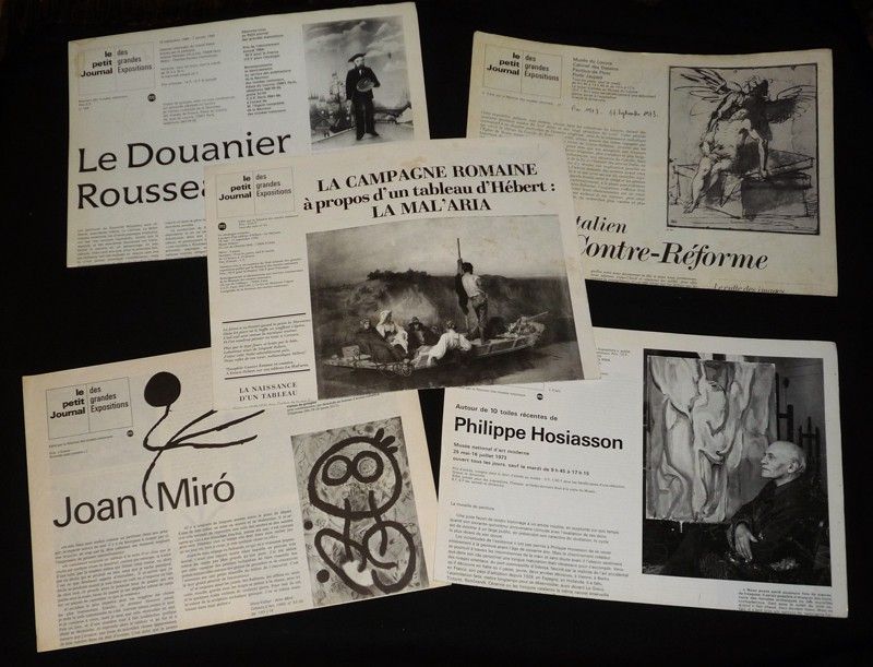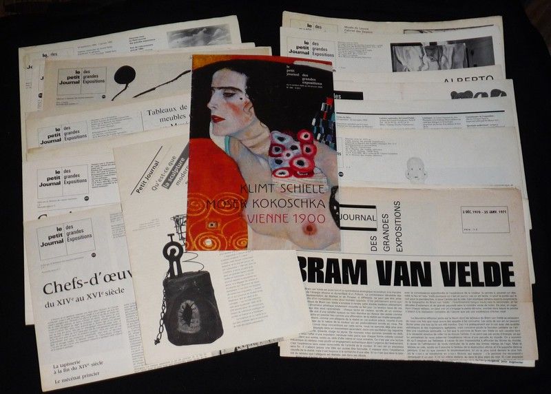 Lot de 21 numéros du "Petit Journal des grandes Expositions" (32 x 45 cm pour la plupart des numéros), comprenant les numéros suivants, dont deux sont en double exemplaire (non numérotés jusqu'à la nouvelle série) : Bram van Velde (02/12/70 - 25/01/71) // Le Futurisme (19/09/73 - 19/11/73) // L'Egypte avant les pyramides (30/05/73 - 03/09/73) // Vieira da Silva (24/09/88 - 21/11/88) // Man-Ray (08/01/72 - 28/02/72) // Jean Dubuffet au Grand Palais (27/09/73 - 20/12/73) // Alberto Burri (26/05/72 - 10/07/72) // Philippe Hosiasson (26/05/73 - 16/07/73) // Les Dessins italiens sous la Contre-Réforme (mai-septembre 1973) // Qu'est-ce que la sculpture moderne ? (03/07/86 - 13/10/86) ; Nouvelle série : n°2 : Chefs-d'oeuvre de la tapisserie (27/10/73 - 07/01/74) // n°3 : Copies, répliques, pastiches (01/12/73 - 22/04/74) // n°5 : Jean Paulhan à travers ses peintres (02/02/74 - 15/04/74) // n°8 : Juan Gris (15/03/74 - 01/07/74) // n°9 : Edvard Munch (22/03/74 - 13/05/74) // n°10 : Fragonard (sans date) // n°11 Joan Miro (18/05/74 - 13/10/74) // n°13 : Le musée du Luxembourg en 1874 (01/06/74 - 18/11/74) // n°93 : La campagne romaine à propos d'un tableau d'Hébert : La Mal'Aria // n°144 : Le Douanier Rousseau (15/09/84 - 07/01/75) // n°385 : Klimt Schiele, Moser Kokoschka, Vienne 1900 (05/10/2005 - 23/01/2006) ; état variable selon le numéro, quelques traces, pliures, marques d'usage ou taches selon le numéro, assez bon état général.