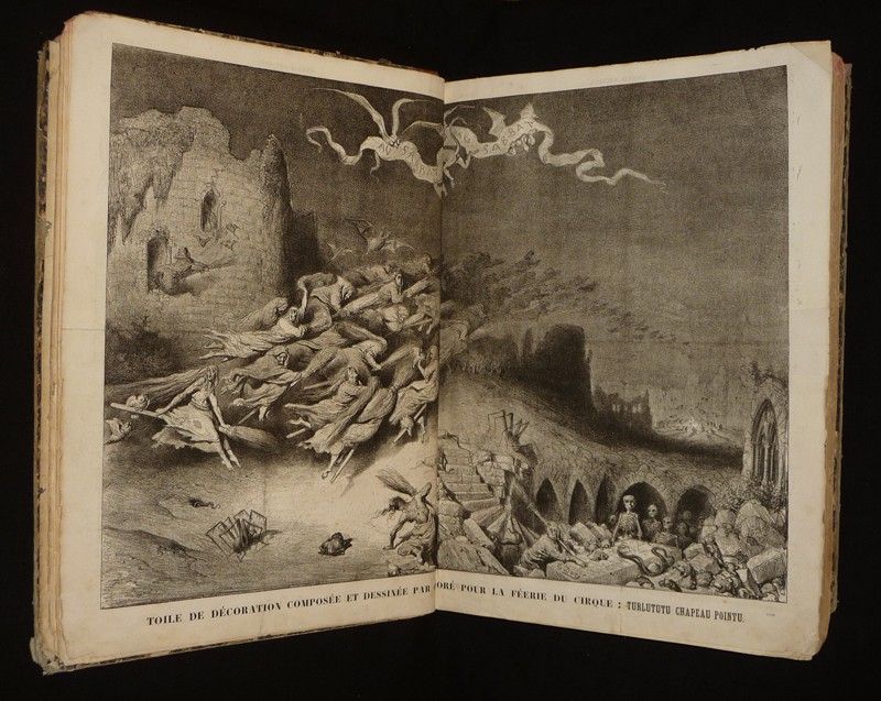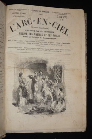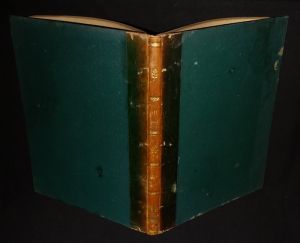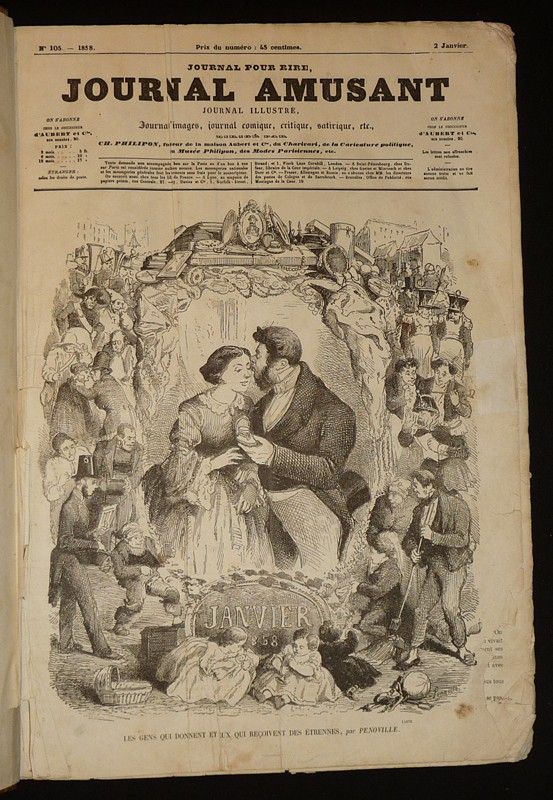 In-folio (30,8 x 43,5 cm), reliure demi-peau, dos lisse, année 1858 du "Journal amusant", du n°105 du 2 janvier 1958 au n°156 du 25 décembre 1858 (SAUF les n°105, 109, 113, et 143), illustrations de Gustave Doré, Riou, etc. épidermures sur le cuir, manques de papier reliure aux plats et manques de carton aux coins, il manque également la première page du fascicule 111, la dernière page du n°115, et le feuillet du milieu du n°116, mouillure dans le coin inférieur du corps d'ouvrage en fin de volume, en l'état.