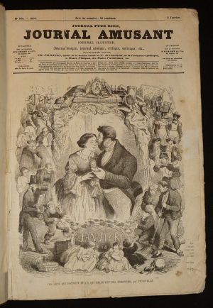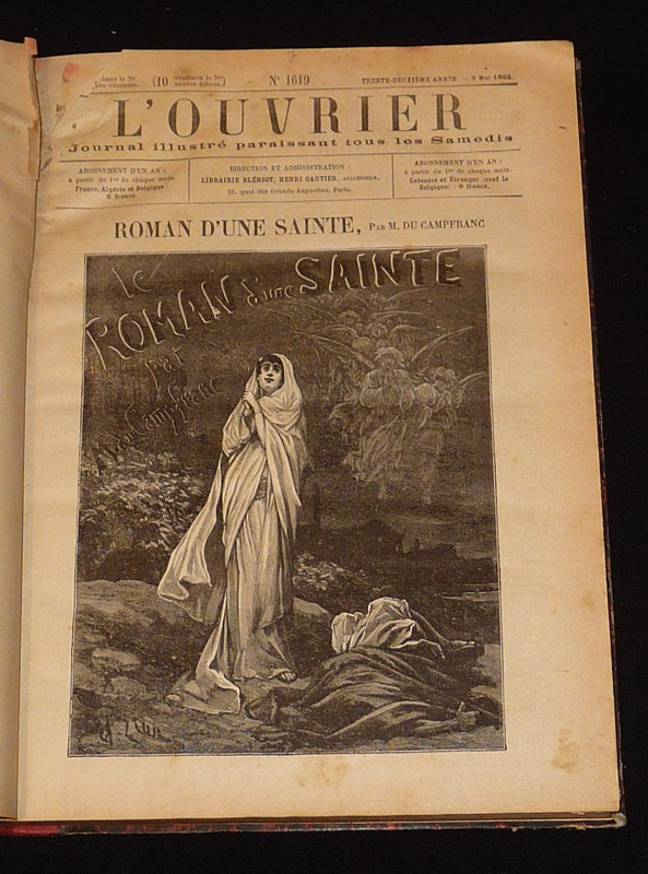 In-4 (22,7 x 30,7 cm), reliure demi-basane, dos lisse, 419 pages, recueil de l'hebdomadaire "L'ouvrier", du n°1619 du 7 mai 1892 au n°1670 du 29 avril 1893 ; coupes usées, plats frottées, manque de papier reliure au premier plat en têtes et traces d'humidité à la première garde et sur les premiers feuillets en tête suite à une mouillure, intérieur bruni mais bien conservé par ailleurs.