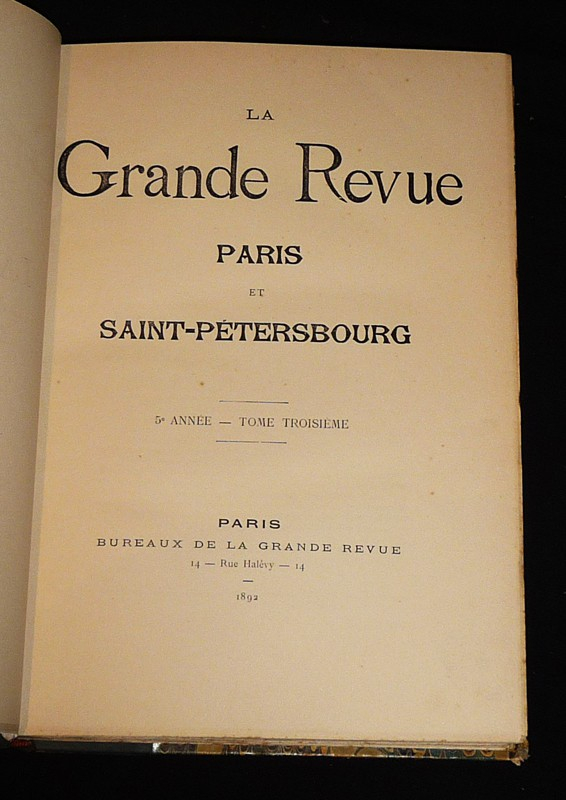 In-4 (20,5 x 28,5 cm), reliure demi-basane, dos à 5 nerfs ornés de fers dorés, tome 3 de la 5e année de la revue, contenant les n°13 du 10 avril 1892 au n°18 du 25 juin 1892 (la tomaison au dos indiquant le tome 2 correspond au 2e trimestre 1892) ; dos insolé, quelques épidermures sur le cuir, épidermure papier au premier plat, coins frottés, rousseurs aux tranches et quelques-unes à l'intérieur par ailleurs frais, assez bon état général.