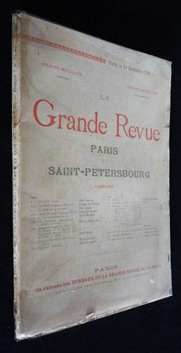 In-4 (19,3 x 28,4 cm), broché, paginé de 218 à 328, n°2 de la IVe année (25 octobre 1890) de la Grande revue ; bords des plats frottés, plats défraîchis, coiffe inférieure manquante, par ailleurs bon état général.