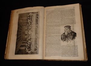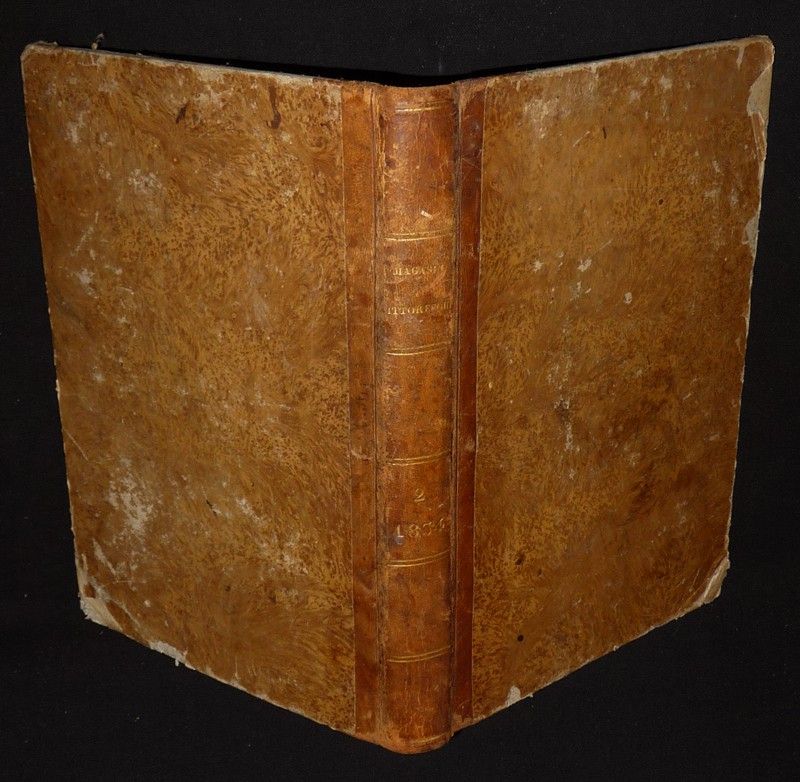 In-4 (20 x 29,3 cm), reliure demi-peau, 2e année de la revue "Le Magasin pittoresque", 412 pages ; coupes usées, petits manques de papier reliure sur les bords des plats, cartonnage corné dans le coin inférieur du quatrième plat, état moyen.