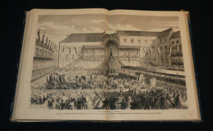 Deux volumes in-folio (28 x 37,5 cm), reliure demi-toile, dos lisses, année 1861 complète du "Monde illustré", nombreuses gravures en noir dont plusieurs à pleine page ; épidermures sur la toile, coiffes usées, frottements et petits manques de papier reliure aux plats, quelques rousseurs à l'intérieur, n°243 du 7 décembre 1861 taché, par ailleurs intérieur assez bien conservé, assez bon état général.