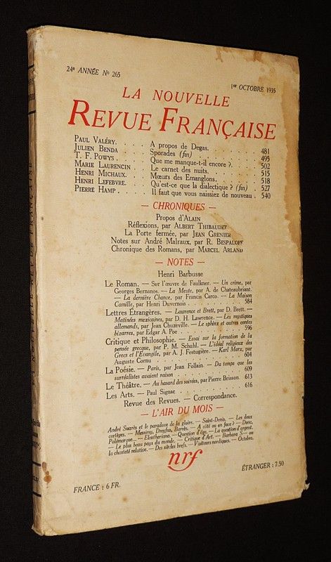 In-8 (14 x 22,5 cm), revue brochée, paginée de 195 à 384, nouvelle série "la nouvelle nouvelle revue française" ; pliure au dos, quelques traces sur les plats, par ailleurs bon état général....