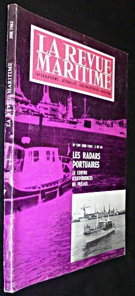 In-8 (15,5 x 24 cm.), revue en brochure éditeur, de la page 700 à la page 826, La revue maritime n°189 (juin 1962) sur Les Radars portuaires, illustrations noir et blanc dans le texte ; coiffes et mors frottés, dos incurvé, menus incidents sur les plats, intérieur frais, bon état.