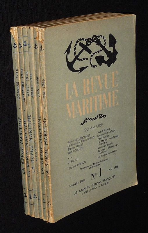 In-8 (15,8 x 24 cm), broché, n°1 (mai 1946) à 6 (octobre 1946) de la nouvelle série de la Revue Maritime ; frottements aux dos, petites déchirures aux mors des n°1 et 6, quelques pliures au quatrième plat du n°1, par ailleurs assez bon état général.