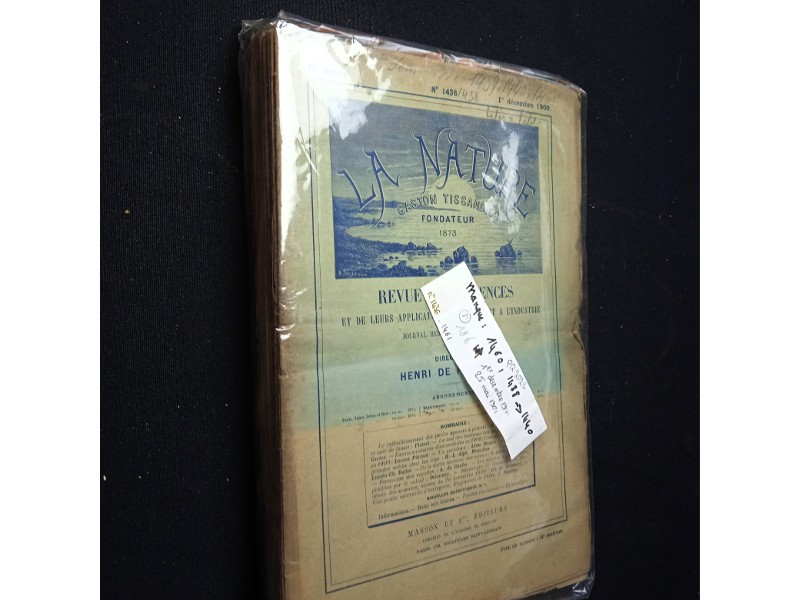 In-4 (30,5 x 20,5 cm), broché, n°1436 à 1459 de la revue La Nature (1er décembre 1900 - 11 mai 1901) ; déchirure (avec manque) sur le dernier plat et la dernière page, quelques salissures, bon...