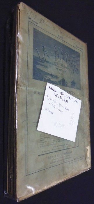 In-4 (30,5 x 20,5 cm), sous chemise d'éditeur, n°862 à 887 de la revue La Nature (7 décembre 1889 - 31 mai 1890) ; déchirures sur la chemise, petites marques d'usure, bon état général....
