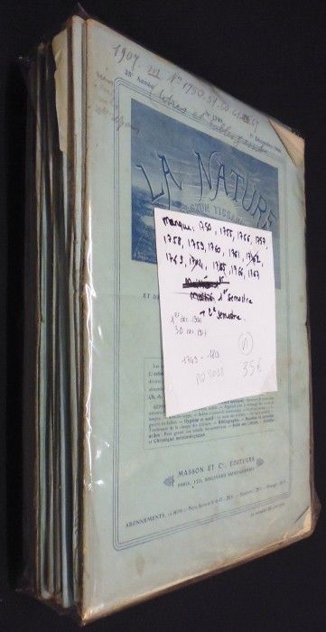 In-4 (30,5 x 20,5 cm), broché, n°1436 à 1459 de la revue La Nature (1er décembre 1900 - 11 mai 1901) ; déchirure (avec manque) sur le dernier plat et la dernière page, quelques salissures, bon...