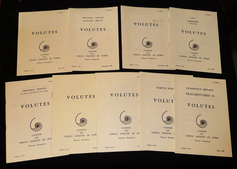 In-8 (17 x 24 cm), dos agrafé, lot de 9 numéros à suivre de ""Volutes : Cahiers du Cercle angevin de poésie"", du n°19 de mars 1989 au n°27 de mars 1991 quelques traces et pliure ou froissements aux plats, par ailleurs bon état général.