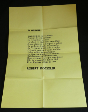 In-8 (17,2 x 23 cm), revue, cinq poèmes-affiches, textes de Robert Kociolek ; rousseurs sur la chemise au recto et au verso, par ailleurs assez bon état général.